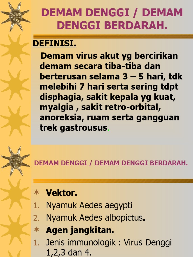 Demam denggi disebabkan oleh gigitan nyamuk aedes dan boleh menyebabkan simptom yang bermacam-macam daripada sakit kepala dan otot sehinggalah ke muntah sakit perut dan pendarahan. Apakah dia Demam Denggi. Demam campak merupakan sejenis penyakit yang sangat mudah berjangkit dan menyebabkan.
