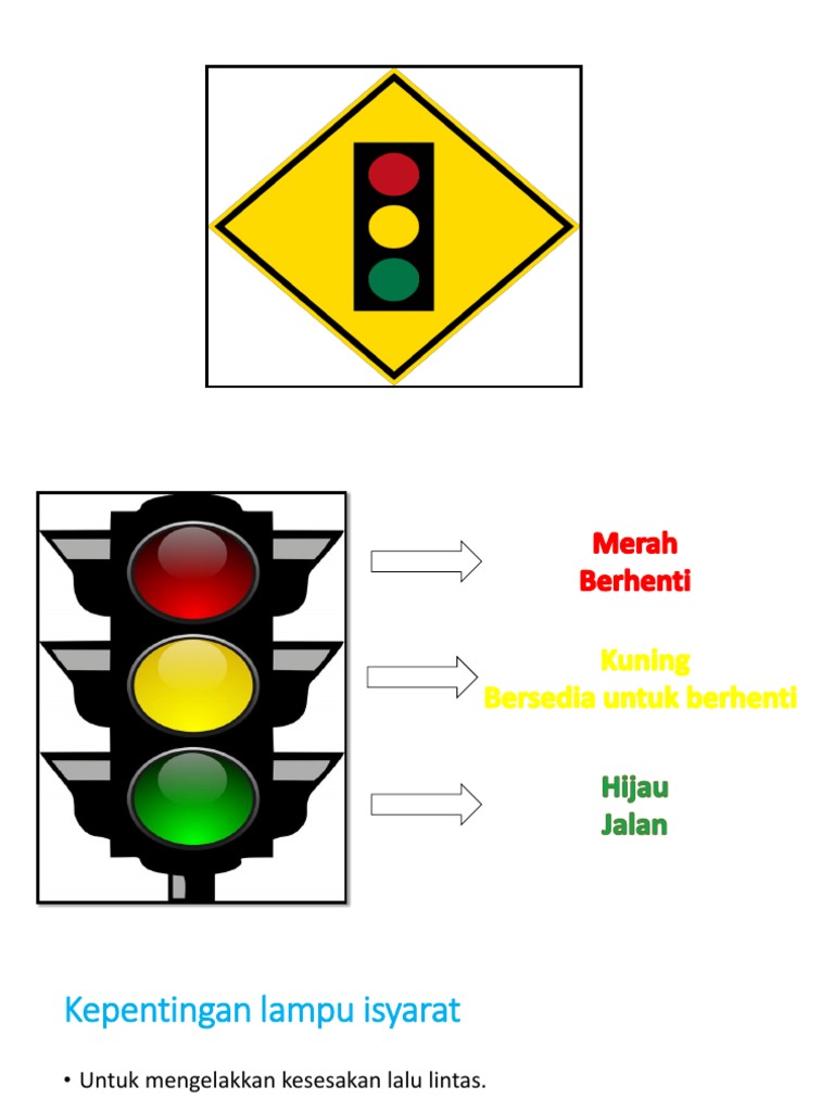Lampu isyarat adalah suatu alat pemberi isyarat yang ditempatkan di persimpangan jalan lintasan pejalan kaki atau lokasi-lokasi lain untuk menunjukkan keadaan aman untuk mengendarai atau berjalan sesuai dengan kod warna sejagat. 1 4 23 Ke kanan1Warna lampu isyarat bersedia untuk berhenti adalah ______________. Warna merah Warna kuning Warna hijau Papan tanda ini banyak terdapat di bandar dan laluan lalu lintas yang sesak.